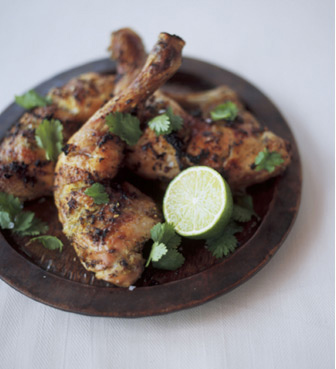 Frunzele de coriandru – trebuie să fie proaspete – se pun într-un bol încăpător, împreună cu sucul şi pulpa de la o lămâie, iarba de lămâie, usturoiul rămas, ghimbirul, puţină sare, câteva boabe de piper şi o linguriţă de curry (dacă aveţi). Adăugaţi două linguri de ulei de măsline şi amestecaţi-le cu ajutorul unui robot de bucătărie pentru a obţine o masă consistentă. Pulpele se iau din marinadă, se ung cu această compoziţie după care pot fi gătite pe grătar. Atenţie doar, jarul să fie potrivit pentru a nu se arde.