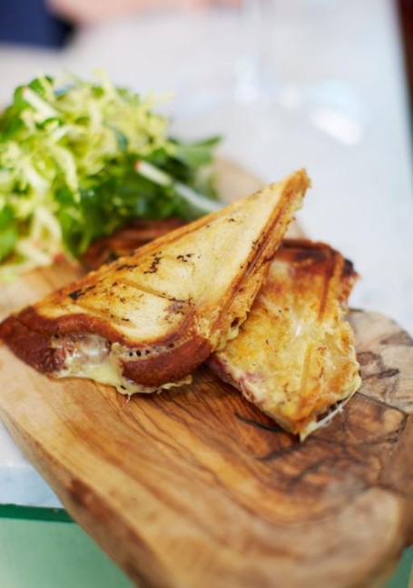 Aplicaţi unt pe feliile de pâine cu menţiunea că untul va fi pe părţile din exterior, nu pe cele din interior. Puteţi pune feliile cu unt pe un dog şi aplicaţi deasupra pe rând brânza Camanbert, şunca şi brânza Ceddar. Cele două toast-uri se introduc în aparat pentru 4-5 minute sau până când vor obţine o culoare aurile. Trick-ul cu untul în exterior este pentru a face pâinea mult mai crocantă, dar şi pentru aromă. Între timp, puneţi salata şi frunzele de ruccola într-un bol, adăugaţi mărul tăiat în felii subţiri, o priză de sare şi piper negru proaspăt măcinat şi oţetul, amestecaţi bine şi serviţi alături de toast.