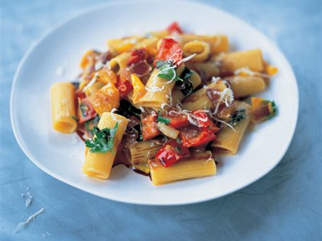 – 2 pepperoni, tăiaţi şi curăţaţi de seminţe, 2 ardei galbeni sau verzi, tăiaţi şi curăţaţi, ulei de măsline extra virgin, sare de mare şi piper negru, 2 cepe roşii curăţate şi tăiate felii, 2 căţei de usturoi curăţaţi şi tăiaţi felii, pătrunjel proaspăt mărunţit, 2 linguri de oţet balsamic, 200g de parmesan, opţional – 2 linguri de mascarpone sau smântână dulce, 500g paste rigatoni (se pot folosi atât penne cât şi spaghette pentru această reţetă)
