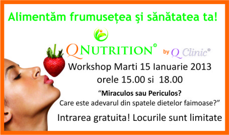 „Miraculos sau Periculos??” Care este adevarul din spatele dietelor faimoase? – Sub această deviză, Q Clinic cu divizia sa Q Nutrition a organizat pe 15 ianuarie 2013 începând cu ora 18 un eveniment dedicat adevărului în ceea ce privește diverse diete faimoase. Intraraea a fost gratuită, participanții având ocazia să primească răspunuri la toate întrebările, pentru a face primii pași către un stil de viață cât mai sănătos.