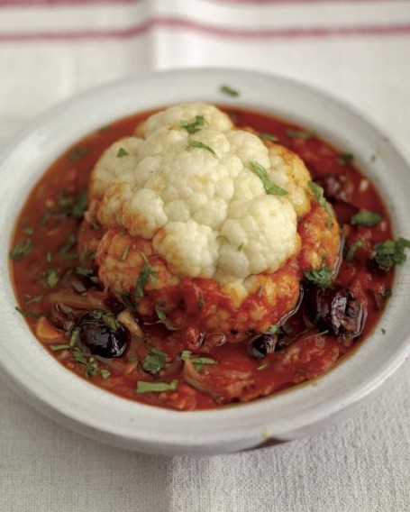 Ingrediente pentru 4 porţii: 1 ceapă roşie, 5 căţei de usturoi tăiaţi mărunt,o conopidă potrivită, ulei de măsline, câteva măsline negre, pătrunjel proaspăt, 3-4 roşii mai mari tăiate cuburi, bulion de casă 400ml sau pastă de tomate diluată cu apă.