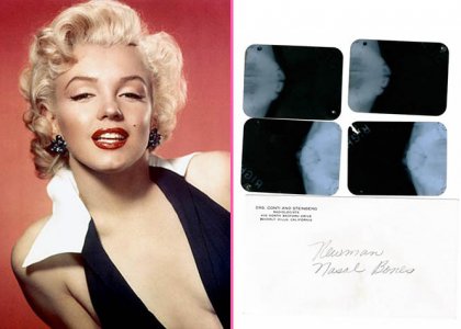 Deşi este recunoscută drept una dintre cele mai frumoase femei din istoria Hollywood-ului, se pare că Marilyn Monroe nu a fost femeia perfectă. Vedeta a apelat în anii 50 la diverse intervenții estetice pentru a arăta cât mai bine. Acum după 51 de ani de la moartea actriţei sunt scoase la licitaţie diverse obiecte care au aparținut frumoasei blonde, pentru sume începând de la 10.000 de Dolari. Printre acestea se află şi o radiografie care confirmă faptul că vedeta a apelat la operaţii estetice mai precis un implant în bărbie şi o rinoplastie.
