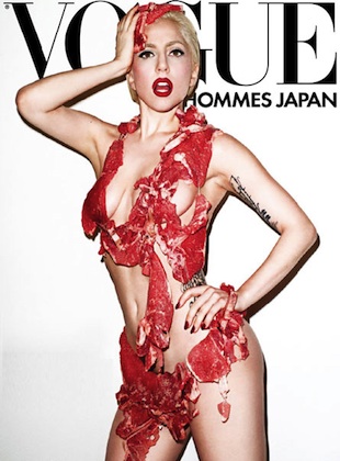 Lady Gaga apare pe coperta numărului de septembrie al prestigioasei publicaţii „Vogue Homme Japonia”, artista fiind îmbrăcată doar… în făşii de carne. Cântăreaţa, recunoscută pentru gusturile extravagante şi predilecţia pentru neconvenţional, nu a mai stat pe gânduri atunci când i s-a propus să pozeze goală cu o „rochie” din carne de vită.