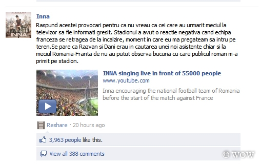 Inna a răspuns pe facebook afirmațiilor lui Răzvan și Dani referitoare la showl ei de la inaugurarea Național Arena.