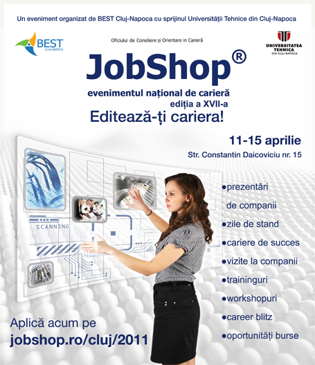 Organizaţia studenţească BEST Cluj-Napoca organizează în perioada 11-15 aprilie cea de-a XVII-a ediţie a evenimentului de carieră JobShop. JobShop este cel mai mare eveniment naţional de carieră pentru studenţii şi absolvenţii din România, fiind dezvoltat de organizaţia BEST în trei dintre cele mai mari centre universitare din ţară: Cluj-Napoca, Iaşi şi Timişoara.