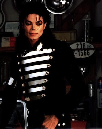 Michael Jackson într-un shooting pentru LA Gear, purtând o jachetă cu modele asemănătoare