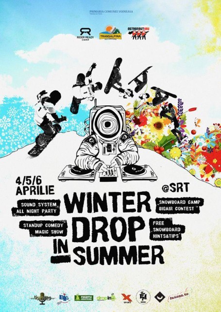 Evenimentul Winter Drop in Summer, organizat în colaborare echipa Rider Ready şi Astronaut Kru, începe vineri, 4 aprilie şi va dura până duminică 6 aprilie. În această perioadă vor avea loc: un concurs de schi şi snowboarding, o petrecere de seară, două spectacole de magie şi stand up comedy şi, cel mai important, trei sesiuni de demonstraţii şi explicaţii pentru schiori şi snowboarderi. În Vidra – Judeţul Valcea, la Ski Resort Transalpina, stratul de omăt este de jumătate de metru, vremea este impecabilă, iar pârtiile perfecte din golul alpin situat între cotele 1830 m – 2000 m, îi fac pe cei care vor alege această destinaţie să se bucure de un weekend petrecut ca în toiul iernii. Se schiază în condiţii bune chiar şi pe pârtiile de sub Telegondolă! Bronzul şi buna dispoziţie vor completa acest sfârşit de săptămână inedit!