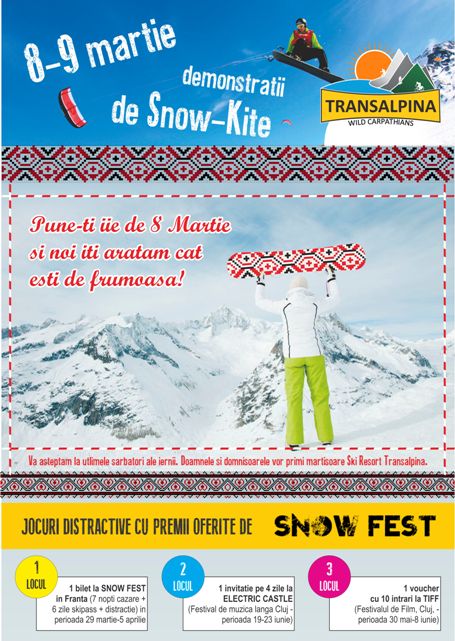Tot la capitolul surprize va fi şi demonstratia de forță a celor care organizează în Franta renumitul Snow Fest. Jocuri distractive vor aduce concurenţilor premii importante – invitatii la festivalurile TIFF şi ELECTRIC CASTLE. Marele premiu va fi probabil şi cel mai disputat: câştigătoarea va merge în 29 martie la SNOW FEST, în Franţa. Șapte nopți de cazare şi sase zile de skipass vor garanta un sejur de vis. În plus demonstrațiile de snow kitting ale celor de la Prorider, vor completa pe cer distracția dintre zăpezi.